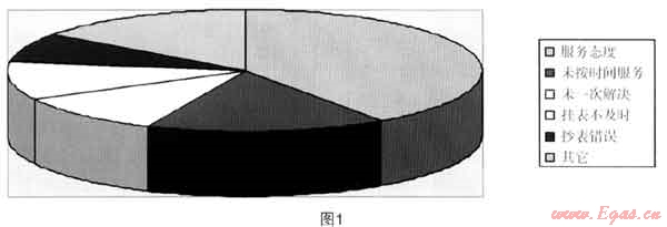 (1) 投訴類(lèi):2010年共計(jì)受理用戶(hù)投訴102戶(hù)次,其中35戶(hù)次投訴為無(wú)效投訴,實(shí)際處理投訴是67戶(hù)次(同比增長(zhǎng)43%,09年實(shí)際處理投訴是47戶(hù)次)。2010年從整個(gè)投訴的內(nèi)容來(lái)看,主要在以下幾個(gè)方面:服務(wù)態(tài)度有27戶(hù)次,占投訴的40%;未按照約定時(shí)間上門(mén)服務(wù)是11戶(hù)次,占投訴的16%;上門(mén)服務(wù)問(wèn)題未一次解決造成的投訴有7戶(hù)次,占投訴的10%;零星用戶(hù)掛表不及時(shí)造成投訴7戶(hù)次,占投訴的10%;抄錯(cuò)表數(shù)、未及時(shí)抄表造成投訴共5戶(hù)次,占投訴的7%;其他投訴10戶(hù)次,如圖1所示。