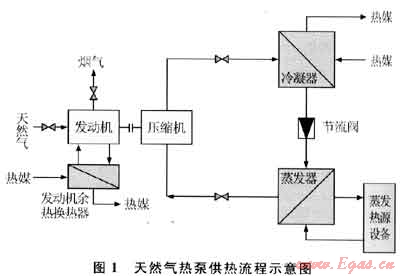 天然氣熱泵供熱的流程見圖1,主要設(shè)備有天然氣發(fā)動機(jī)、壓縮機(jī)、冷凝器、蒸發(fā)器、蒸發(fā)熱源設(shè)備以及利用發(fā)動機(jī)冷卻水的發(fā)動機(jī)余熱換熱器等。供熱回來的熱媒分別經(jīng)熱泵冷凝器和發(fā)動機(jī)余熱換熱器換熱升溫并匯合后供給熱用戶。天然氣在發(fā)動機(jī)中燃燒后經(jīng)絕熱膨脹做功和經(jīng)發(fā)動機(jī)冷卻水冷卻后,煙氣溫度已不太高,但可用作蒸發(fā)器冬天除霜用,本文未考慮煙氣余熱的回收。