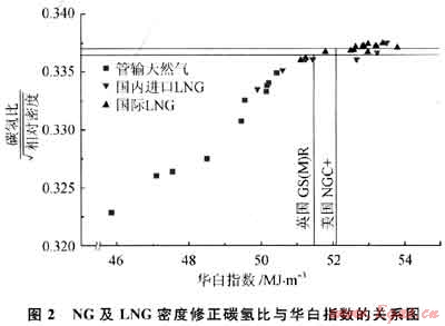 對華白指數(shù)限定范圍的控制是天然氣利用的安全性、環(huán)境排放和效率的保證。燃?xì)獾奶細(xì)浔葦?shù)決定了不完全燃燒指數(shù)的大小或燃燒的C0排放量。圖2給出了相對密度修正的碳?xì)浔群腿A白指數(shù)的關(guān)系。由此可見控制華白指數(shù)范圍與控制碳?xì)浔鹊淖兓粯樱哂邢薅ú煌耆紵笖?shù)或黃焰指數(shù)的同樣功效。圖2中GS(M)R是英國燃?xì)獍踩芾硪?guī)范“Gas Safety(Management)Regulations”的縮寫。