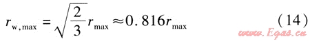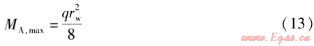 當(dāng)MA,max=Mmax時(shí),管道滿足強(qiáng)度條件。由式(1)、(13)得到活動(dòng)支架A、B最大允許間距rw,max的計(jì)算式為:
