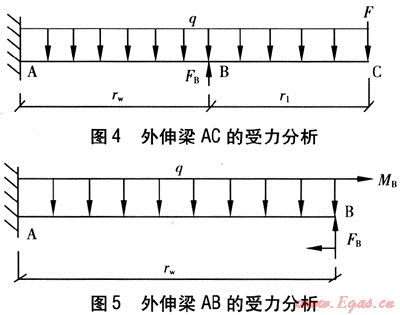 將L形轉(zhuǎn)角附近管段AC作為外伸梁處理,由于活動(dòng)支架A處管道截面的變形量很小,為簡(jiǎn)化計(jì)算,設(shè)定活動(dòng)支架A處管道截面的轉(zhuǎn)角為零,這對(duì)工程計(jì)算結(jié)果的影響很小,可滿足工程設(shè)計(jì)需要。在設(shè)定活動(dòng)支架A處管道截面轉(zhuǎn)角為零的前提下,外伸梁AC、AB的受力分析分別見(jiàn)圖4、5。