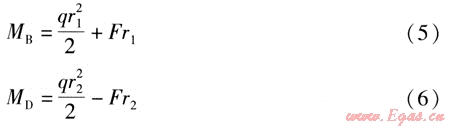 設(shè)r2≥r1,則活動(dòng)支架B、D處管道截面彎矩MB、MD的計(jì)算式分別為: