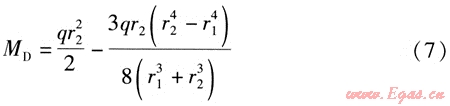 由式(5)、(6)可知,當(dāng)r2≥r1時(shí),MD≥MB。因此,只要活動(dòng)支架D處管道滿足強(qiáng)度條件,活動(dòng)支架B處的管道必然滿足強(qiáng)度條件。將式(4)代入式(6),得到: