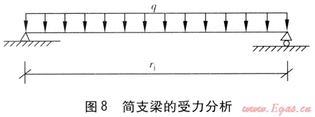 在架空敷設(shè)的供熱管道中,z形架空敷設(shè)的形式也較多見(jiàn)。對(duì)于z形架空敷設(shè)供熱管道,我們考慮兩種敷設(shè)形式:一種是短邊無(wú)活動(dòng)支架的敷設(shè)形式,見(jiàn)圖6;另一種是短邊有活動(dòng)支架的敷設(shè)形式,見(jiàn)圖7。在活動(dòng)支架距兩個(gè)轉(zhuǎn)角較近的情況下(見(jiàn)圖6、7),這兩個(gè)活動(dòng)支架上的管段受力可視為簡(jiǎn)支梁受力,受力分析見(jiàn)圖8。