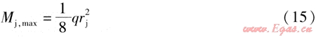 L形架空敷設(shè)形式見(jiàn)圖1,對(duì)于長(zhǎng)直架空敷設(shè)供熱管道,可作為受勻布荷載的等跨距連續(xù)梁處理。設(shè)按強(qiáng)度條件確定的連續(xù)梁活動(dòng)支架最大允許間距為rmax,連續(xù)梁最大截面彎矩Mmax;的計(jì)算式為: