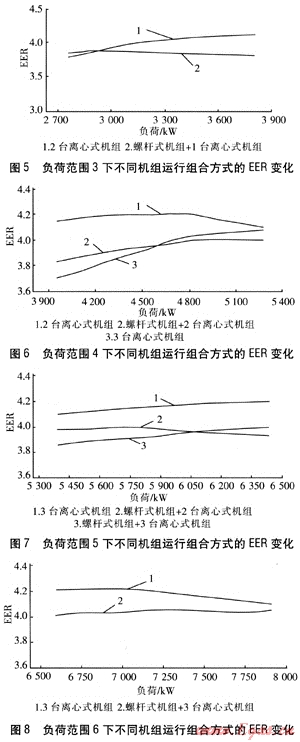 不同負(fù)荷范圍下不同機(jī)組運(yùn)行組合方式的EER變化見圖3~8。由圖3可知,隨著負(fù)荷的增加,開啟離心式機(jī)組時(shí)冷水系統(tǒng)的EER逐漸增加。當(dāng)負(fù)荷為1091kW時(shí),兩者的EER相等。為減少冷水機(jī)組頻繁開停機(jī)次數(shù),提高使用壽命,在低負(fù)荷情況下,單獨(dú)運(yùn)行螺桿式機(jī)組即可。此時(shí),EER較小(1.1~3.3),若考慮末端風(fēng)機(jī)的耗電,整個(gè)空調(diào)系統(tǒng)的EER將會(huì)更低。即使采取大小容量機(jī)組搭配的方式,在較低負(fù)荷時(shí),空調(diào)系統(tǒng)的運(yùn)行效率仍然很低,因此應(yīng)減少冷水機(jī)組的開啟時(shí)間甚至不開啟,盡可能利用新風(fēng)對(duì)室內(nèi)降溫。