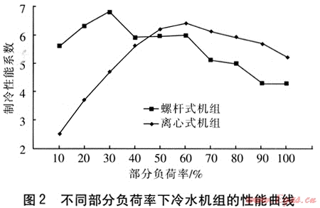 不同部分負(fù)荷率下冷水機(jī)組的性能曲線見圖2。離心式機(jī)組在部分負(fù)荷率為60%時(shí)制冷性能系數(shù)最大,而后隨著負(fù)荷增大而降低。螺桿式機(jī)組在滿負(fù)荷運(yùn)行時(shí)制冷性能系數(shù)最小,當(dāng)部分負(fù)荷率為30%時(shí)最大。
