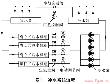 對(duì)于大型空調(diào)系統(tǒng),為使空調(diào)系統(tǒng)在低負(fù)荷運(yùn)行時(shí)也有較高的效率,設(shè)計(jì)人員多采用大容量離心式冷水機(jī)組與小容量螺桿式冷水機(jī)組進(jìn)行組合。當(dāng)負(fù)荷較小時(shí),運(yùn)行螺桿式機(jī)組即可。在進(jìn)行螺桿式機(jī)組選型時(shí),可按照離心式機(jī)組制冷能力的40%進(jìn)行選擇[6]。該空調(diào)系統(tǒng)選用3臺(tái)離心式機(jī)組與1臺(tái)螺桿式機(jī)組,冷水進(jìn)、出水溫度為13、7℃,冷卻水進(jìn)、出水溫為32、37℃。冷水機(jī)組與附屬設(shè)備見表1[7],冷水系統(tǒng)流程見圖1。