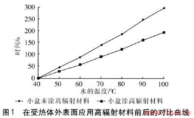 測試平臺如下:兩個一樣的不銹鋼小盆,直徑為160mm,一個在盆底涂刷高輻射材料,另一個不涂,小盆裝相同的水,在相同的電爐上測試水的升溫時間,多次測量后,取平均值。在受熱體外表面應(yīng)用高輻射材料前后的對比曲線見圖1。