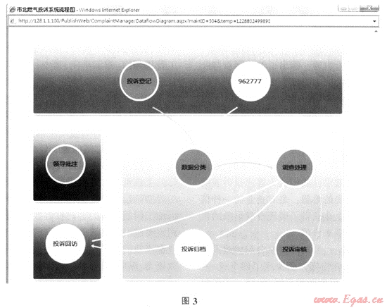 由于每條投訴信息均規(guī)定了統(tǒng)一的處理流程,因此,我們可以通過系統(tǒng)查詢某條信息正處于投訴處理的哪個階段,并以不同顏色予以區(qū)分,其中,綠色表示已經(jīng)通過的階段,白色表示尚未完成的階段,并且,某條投訴若上級或領(lǐng)導作過批注,則以紅色表示,具體如圖3所示: