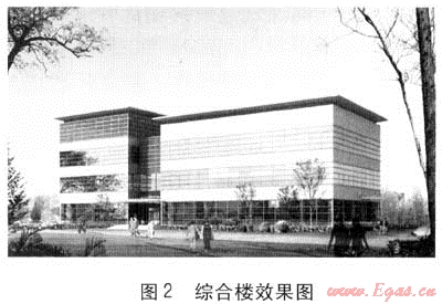 綜合樓建筑風(fēng)格簡(jiǎn)潔現(xiàn)代,結(jié)合總圖采取矩形布局,建筑朝向?yàn)槟媳毕?,長(zhǎng)邊與廠外主要道路平行。建筑體型采用三個(gè)不同高度的體塊相間穿插布置,顯得錯(cuò)落有致。建筑外檐采用帶形熱反射玻璃幕墻與鋁合金金屬幕墻相結(jié)合,線條流暢,給人一種十足的現(xiàn)代感。局部安放空調(diào)室外機(jī)組的屋面采用金屬百葉做圍護(hù)結(jié)構(gòu),既對(duì)設(shè)備起到了視覺(jué)上的遮擋作用,本身又成為外立面不可或缺的重要組成部分,可謂一舉兩得??v觀整個(gè)建筑,本身并不作繁冗裝飾,而是采用豐富的體型、干凈利落的細(xì)部刻畫(huà)以及協(xié)調(diào)大方的色彩取勝。而鋁合金金屬幕墻、熱反射玻璃幕墻、鋁合金裝飾百葉這些新材料的運(yùn)用,又使整個(gè)建筑顯得既簡(jiǎn)潔明快,又不乏時(shí)代感,反映了工業(yè)建筑的精神,現(xiàn)代企業(yè)的氣質(zhì)也在這里得以彰顯。綜合樓效果圖見(jiàn)圖2。
