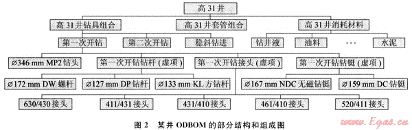 在鉆井過(guò)程中,一口井物料的消耗可由鉆井設(shè)計(jì)所形成的鉆具組合、套管組合、鉆井液和其他主要輔助材料等來(lái)確定[6]。將鉆井設(shè)計(jì)所形成方案中物料的使用及物料之間的關(guān)系與傳統(tǒng)制造業(yè)BOM進(jìn)行對(duì)比,可構(gòu)造出類(lèi)似于制造業(yè)ERP中BOM的石油鉆井物料清單(Oil Drilling Bill Of Material,即ODBOM)。在ODBOM的構(gòu)造中,從結(jié)構(gòu)上可將一口井視為一個(gè)產(chǎn)品,結(jié)構(gòu)中的第一層以虛項(xiàng)[3]形式分別表示鉆井過(guò)程中鉆具組合、套管組合所需使用器材的模塊和消耗材料模塊。其中消耗材料模塊清單由鉆井液、油料、泥漿等組成。而鉆具組合和套管組合中所使用器材的清單結(jié)構(gòu)需根據(jù)鉆井開(kāi)次分別構(gòu)造。以鉆具組合中各種鉆井器材使用為例,油氣井的施工過(guò)程是由多次開(kāi)鉆順序組成,每次開(kāi)鉆鉆進(jìn)過(guò)程中所使用的各種鉆井器材等,按照鉆具組合設(shè)計(jì),這些器材之間(如鉆頭、鉆鋌、鉆桿等)是以一定的方式形成連接組合關(guān)系。下面是某口井第一次開(kāi)鉆的鉆具組合: