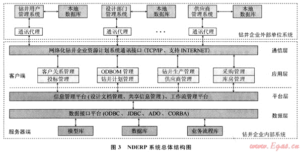 整個(gè)系統(tǒng)結(jié)構(gòu)分為企業(yè)外部和企業(yè)內(nèi)部軟件系統(tǒng)。企業(yè)外部軟件系統(tǒng)包括用戶管理系統(tǒng)、設(shè)計(jì)部門(mén)管理系統(tǒng)和鉆井物資供應(yīng)商管理系統(tǒng),并通過(guò)NDERP系統(tǒng)的通訊接口與企業(yè)內(nèi)部系統(tǒng)進(jìn)行信息交換和共享。企業(yè)內(nèi)部軟件系統(tǒng)由系統(tǒng)管理服務(wù)器端和客戶端軟件組成。服務(wù)器端分為數(shù)據(jù)層和平臺(tái)層,其中數(shù)據(jù)層是由面向鉆井企業(yè)資源計(jì)劃管理和物資供應(yīng)的數(shù)據(jù)庫(kù)、模型庫(kù)和業(yè)務(wù)流程庫(kù)組成;平臺(tái)層是根據(jù)企業(yè)的需求定制相應(yīng)的工作流、協(xié)同工作、信息交換等,是NDERP系統(tǒng)柔性和協(xié)作性的一個(gè)體現(xiàn)方面??蛻舳朔譃閼?yīng)用層和通訊層,其中應(yīng)用層是由應(yīng)用軟件系統(tǒng)組成,主要是根據(jù)鉆井過(guò)程,結(jié)合ERP管理思想,實(shí)現(xiàn)企業(yè)鉆井物資的計(jì)劃制定、合理配置和優(yōu)化管理;通訊層是實(shí)現(xiàn)網(wǎng)絡(luò)化鉆井的分布式計(jì)算平臺(tái)和數(shù)據(jù)信息傳輸平臺(tái)。