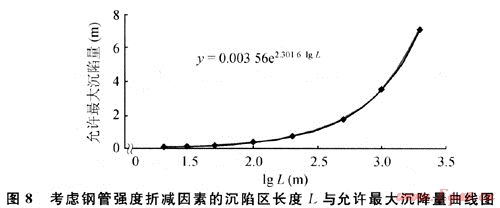 2) 根據(jù)《輸氣管道工程設(shè)計規(guī)范》[3]的有關(guān)規(guī)定,在輸氣管道系統(tǒng)中,支管道沒有軸向約束(如固定支墩或其他錨固件)時,使管道附件產(chǎn)生的彎曲應(yīng)符合公式:σe≤0.72σs(σe為組合應(yīng)力;σs為管道的最低屈服強度),按假設(shè)受力模型的簡化分析和采用的算例,X70鋼管屈服強度為485MPa,則0.72σs=349.2MPa,可得管道通過不同長度沉陷區(qū)的允許最大沉陷量和其回歸方程(圖8)。