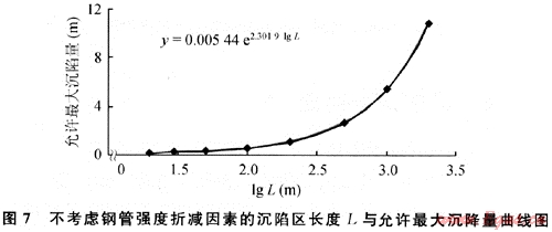 1) 按假設(shè)受力模型的簡化分析和所采用的計算方法,X70鋼管屈服強度為485MPa,并以此作為管道遭遇危險的判定標準,在不考慮鋼管強度的折減因素前提下,可得管道通過不同長度沉陷區(qū)的允許最大沉降量,并用最小二乘法建立了管道允許最大沉陷量與沉陷區(qū)長度的回歸方程,結(jié)果如圖7所示。