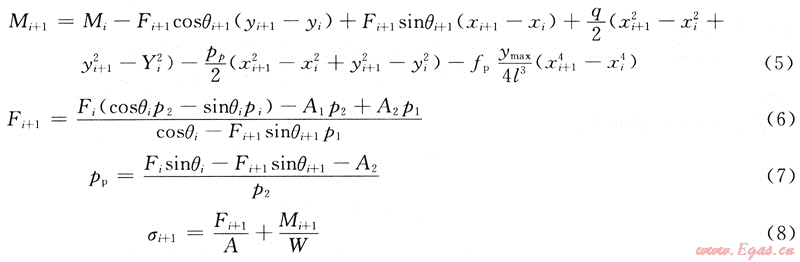 式中:A1=q(yi+1-yi);A2=q(xi+1-xi);p1=yi+1-yi+(xi+1-xi)tanφp;p2=-(xi+1-xi)+ (Yi+1-yi)tanφp;Fi為第i點管端軸力;Mi為第i點管端彎矩;σi為第i點管端應(yīng)力;θi為第i點管端各點轉(zhuǎn)角;W為管道彎曲截面系數(shù)。