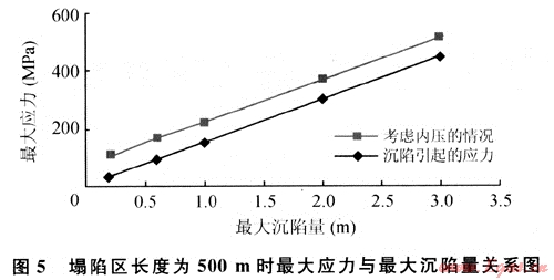2) 按開采沉陷引起的管道中最大應(yīng)力值、內(nèi)壓與開采沉陷引起的管道中最大應(yīng)力值組合分別計算,結(jié)果見圖3~5。