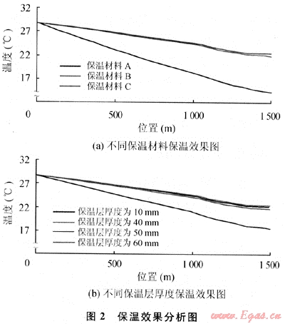 對材料B分別進(jìn)行保溫厚度的敏感性分析,分析結(jié)果如圖2(b)所示。由圖可知:不同材料沿程溫度變化規(guī)律基本一致,但保溫材料傳熱系數(shù)越大,沿程溫度變化越明顯;隨著保溫層厚度的增加,保溫效果越好,但當(dāng)保溫層厚度增加到一定值時,保溫效果的增加程度不明顯。