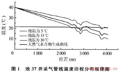 圖1為池37井在井口溫度為40℃時,不同地溫下的沿程溫度分布及天然氣水合物生成曲線圖。從圖上可以看到管線高程對管線沿線壓力、溫度影響非常大,而且隨著管線位置變化,壓力的變化引起各點(diǎn)的天然氣水合物生成溫度也發(fā)生了變化。管線進(jìn)站溫度最低,并不是在此處形成的天然氣水合物溫度最低,因此進(jìn)行管線設(shè)計時要綜合考慮預(yù)測天然氣水合物形成溫度,不能僅以終點(diǎn)不形成天然氣水合物,就認(rèn)為管線沿程都不生成天然氣水合物。