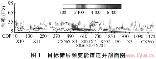 圖1所示是新場T511層頻變能譜連井剖面,重點關注的頻譜在橢圓區(qū)內。圖中顯示,在該儲層段內,獲得高產(chǎn)工業(yè)氣流的X10、X3、X856、X851、X853、X2、X202等井在低頻段(低于15Hz)具有較強的瞬時譜響應;獲得低產(chǎn)工業(yè)氣流的IA50、X5等井在低頻段(低于15Hz)具有相對較弱的瞬時譜響應;未獲工業(yè)氣流的干井X11、CX560井和產(chǎn)水的CX565、X201井在低頻段無強瞬時譜響應特征。
