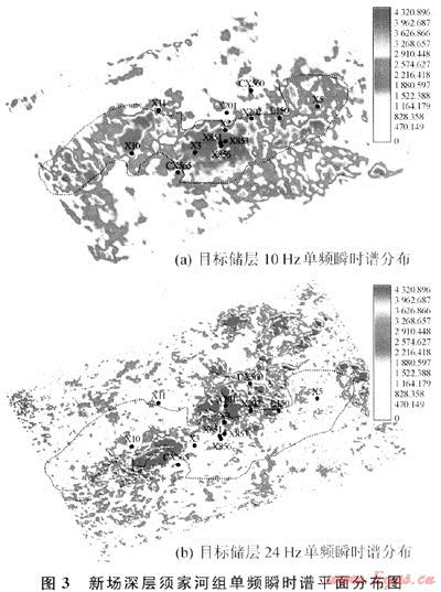 圖3所示是新場地區(qū)深層須家河組單頻瞬時譜平面分布情況,其顯示的瞬時譜具有十分明顯的差異。在圖3-a中,低頻強瞬時譜區(qū)域(紅色)包括了所有天然氣高產(chǎn)工業(yè)井,低產(chǎn)井分布在低頻弱瞬時譜區(qū)域(淺藍色),水井分布區(qū)域低頻瞬時譜更弱(白色)。在圖3-b中的多邊形框內,高頻強瞬時譜是泥巖響應,而高頻弱瞬時譜是有效砂巖儲層響應。雖然,含氣儲層和含水儲層在高頻段有相似的響應特征,但是,結合已知井信息,將圖3-a與圖3-b進行仔細對比,就可以發(fā)現(xiàn)含氣儲層和含水儲層具有不同的時頻響應規(guī)律。