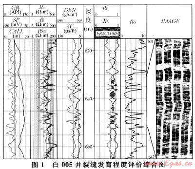將上述評(píng)價(jià)裂縫發(fā)育程度指標(biāo)的計(jì)算模型和參考文獻(xiàn)[1]所述巖石力學(xué)動(dòng)靜態(tài)轉(zhuǎn)換關(guān)系式編制成Fortran語言,掛接在Forward測(cè)井解釋平臺(tái)上,實(shí)現(xiàn)單井逐點(diǎn)可視化處理。對(duì)工區(qū)內(nèi)10多口具有成像測(cè)井資料和巖心描述的井進(jìn)行了裂縫發(fā)育程度指標(biāo)處理,圖1為白005井裂縫發(fā)育程度評(píng)價(jià)綜合成果圖。由圖1不難發(fā)現(xiàn),630~652m井段,完整性系數(shù)值較低、裂縫發(fā)育程度指標(biāo)值較高、巖石穩(wěn)定系數(shù)值偏低,從所對(duì)應(yīng)的成像測(cè)井圖上可以看出,該段斜交縫和網(wǎng)狀縫較為發(fā)育,巖心描述為半充填的低角度和網(wǎng)狀縫。從工區(qū)內(nèi)其他井的處理情況來看,處理結(jié)果與成像測(cè)井和巖心描述對(duì)應(yīng)性都較好。因此,筆者所述方法對(duì)研究工區(qū)火山巖裂縫發(fā)育程度評(píng)價(jià)較為有效。