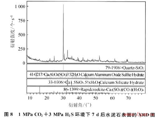 圖8、9是1MPa C02+3MPa H2S環(huán)境下水泥石界面腐蝕7d和14d后X射線衍射成果圖(XRD)。