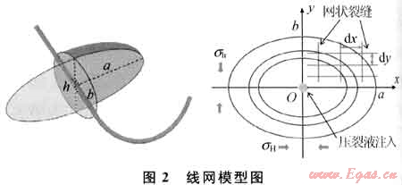 線網(wǎng)模型為半解析模型(圖2),泄流區(qū)域呈橢圓形,有兩組垂直正交的裂縫分別平行于橢圓平面上兩個主應(yīng)力(σh、σH),為避免裂縫間距的主觀性,dx、dy依據(jù)實際測試數(shù)據(jù)確定,橢圓的長短軸a和b以及高度h由微地震結(jié)果給出。