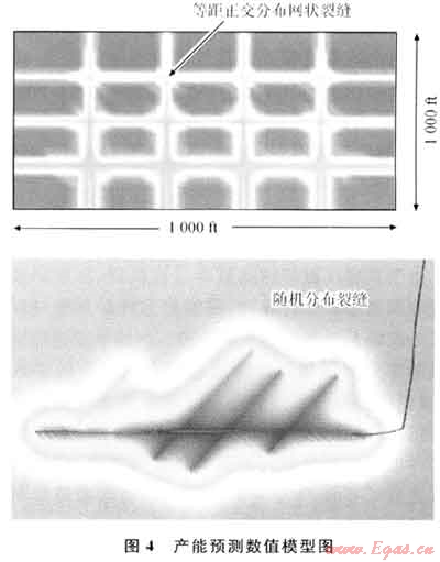 Zhang等[11]采用了微地震解釋獲得的潛在裂縫分布狀態(tài)結(jié)果,得到模擬主要橫切裂縫的雙重介質(zhì)油藏模型。計算中考慮了裂縫間距、非達西效應(yīng)等對產(chǎn)能的影響,表明產(chǎn)能對竄流因子參數(shù)最為敏感。