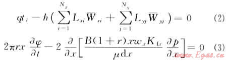 式中q為壓裂液量,m3/d;ti為壓裂液排量,m3/min;Lxi、Lyj分別為x和y方向裂縫段長度,m;Wxi、Wyi分別為x和y方向裂縫段寬度,m;Kfx、Kfy分別為x和y方向裂縫滲透率,mD;r為橢圓的寬高比;B為橢圓積分。