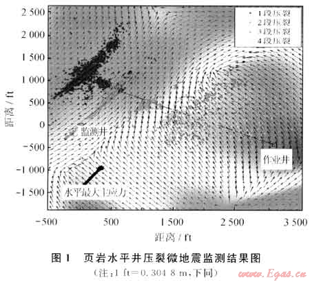 常規(guī)壓裂形成的裂縫一般呈雙翼對稱裂縫的形式。但頁巖氣壓裂中微地震監(jiān)測的結(jié)果表明,裂縫的形態(tài)復(fù)雜多變,如圖1所示[2]。1口水平井壓裂后微地震監(jiān)測結(jié)果表明,第1、2段壓裂施工形成了垂直于水平井段的平面縫,第3、4段施工形成了網(wǎng)狀裂縫。目前認為頁巖氣壓裂目的,就是要建立一個獨立于傳統(tǒng)意義裂縫半長的更加龐大的裂縫網(wǎng)絡(luò)系統(tǒng),實現(xiàn)更大規(guī)模的儲層改造波及體積;生產(chǎn)實踐也證明了儲層改造體積越大壓后增產(chǎn)效果越好。