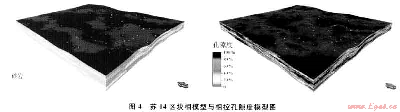 蘇里格氣田為河流相沉積,相控儲(chǔ)層建模很好地解決了該氣田儲(chǔ)層橫向相變快和強(qiáng)非均質(zhì)性的特點(diǎn),在高效開(kāi)發(fā)過(guò)程中,相控儲(chǔ)層建模取得了較好的效果(圖4),為氣田開(kāi)發(fā)提供了可靠的地質(zhì)模型。