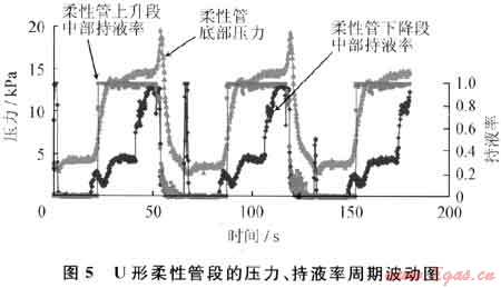 圖5是氣、液相折算速度都為0.30m/s時U形柔性管的壓力、持液率周期波動圖。在液塞形成階段液塞頭進入U形柔性管之前,U形柔性管內(nèi)少量液體振蕩流動,U形柔性管底部壓力較小并有小幅度的波動。液塞進入U形柔性管后,U形柔性管下降段中部持液率先開始上升,由于下降段傾角較大,液體在下降段為分層流,U形柔性管下降段中部持液率值較小。隨著液塞頭在上升段中生長,U形柔性管底部壓力開始增大,當(dāng)?shù)竭_上升管探針處時,U形柔性管上升段中部持液率從0變?yōu)?。在液塞生產(chǎn)階段,U形柔性管底部壓力與U形柔性管上升段中部持液率不再增長。隨著液塞不斷流入U形柔性管,U形柔性管上升段中部持液率慢慢增大。在液氣噴發(fā)階段,由于液塞加速,U形柔性管底部壓力先迅速增大然后迅速減小到最小值,U形柔性管上升段中部持液率迅速增大到1。隨著液塞尾經(jīng)過U形柔性管,液體回落,U形柔性管上升段中部持液率和u形柔性管上升段中部持液率迅速減小直至重新變?yōu)?,開始下一個嚴重段塞流周期。