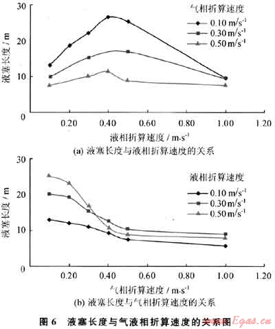 液塞長度隨著氣相折算速度的增加而減小。當(dāng)液相折算速度恒定時,隨著氣相折算速度的增加,嚴重段塞流周期變小,流入立管的液體減少,因而液塞長度減小。同樣,圖2所示的流型圖也反應(yīng)了這種現(xiàn)象。