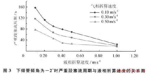 圖3為下傾管傾角為-2°時嚴重段塞流周期與液相折算速度的關(guān)系圖。從圖3可以看出嚴重段塞流周期隨液相折算速度的增大而減小。實驗顯示形成嚴重段塞流時下傾管為分層流。液相折算速度增大時,下傾管持液率增加,氣相空間相應(yīng)減小,相同時間內(nèi)氣相壓力增加值變大,因此嚴重段塞流周期變短。同時從圖3還可以看出嚴重段塞流周期隨氣相折算速度的增大而減小,當(dāng)氣相折算速度增加時,下傾管內(nèi)的氣體壓力上升速度增加,下傾管內(nèi)的氣相壓力值達到立管底部所受最大靜水壓力的時間變短,因此嚴重段塞流周期變短。