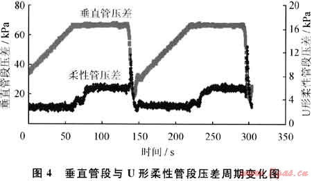 從圖8中可以看出,Ⅰ比Ⅲ的壓力波動幅度稍大,差值為3~4kPa。這主要是由于Ⅲ的垂直管高度與U形柔性管垂直高度之和比Ⅰ的略小,壓力的最高值就小一些,因此壓力波動幅度小。