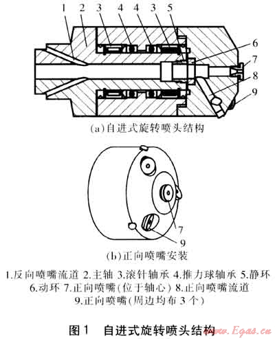 自進(jìn)式旋轉(zhuǎn)射流解堵工藝的關(guān)鍵設(shè)備為自進(jìn)式旋轉(zhuǎn)噴頭,其結(jié)構(gòu)見圖1。