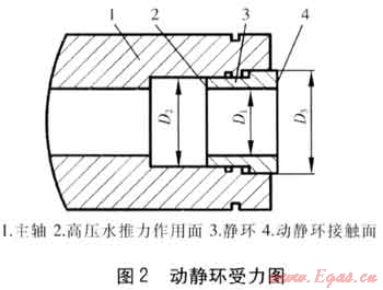 摩擦阻力矩產(chǎn)生在密封靜環(huán)和密封動環(huán)的接觸面上,摩擦阻力矩的大小與密封靜環(huán)和密封動環(huán)的材質(zhì)、加工精度、接觸面端面壓力等有關(guān)。動靜環(huán)受力圖見圖2。