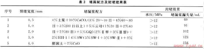 通過材料優(yōu)選確定以GQJ-Ⅱ型、GQJ-Ⅲ型為主要架橋材料,SW-Ⅰ、SW-Ⅱ?yàn)槔w維材料,不同粒徑的CaC03和云母作為片狀填充材料,并配合高失水劑HH-1及無機(jī)鹽Ca0,根據(jù)Howard和Scott的SAN-2工程分布理論[11]確定了各種材料的粒徑級配,形成抗高溫堵漏配方,并用堵漏儀對0.5~4mm之間的縫板進(jìn)行承壓堵漏效果評價。試驗(yàn)數(shù)據(jù)見表2,通過實(shí)驗(yàn)數(shù)據(jù)可以看出,不同縫寬下承壓能力均高于12MPa。