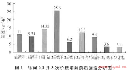上述3次堵漏前后漏速統(tǒng)計結(jié)果如圖1所示,由圖1可知每次橋接堵漏之后循環(huán)時漏速降低,鉆進(jìn)后漏速增高,說明新鉆地層裂縫、孔隙較為發(fā)育,也存在一定程度的漏失,3次橋接堵漏之后,正常鉆進(jìn)時漏速由11m3/h降至3.4m3/h,說明橋接堵漏起到了一定的效果。