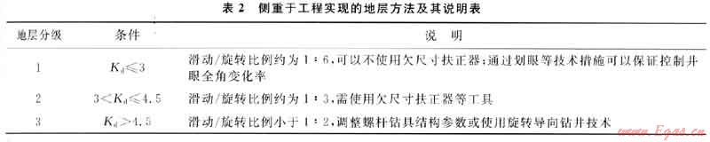 基于上述認(rèn)識,可進(jìn)而提出以工程實現(xiàn)能力為依據(jù)的地層分級方法。即根據(jù)井眼尺寸和地層對于鉆井手段的響應(yīng)效果進(jìn)行分級。例如,在大牛地氣田,根據(jù)地層可鉆性級值,Φ215.9mm井眼可以將地層分為3級(圖3)。地層可鉆性級值(Kd)小于3的可劃分為I級,對應(yīng)的復(fù)合鉆進(jìn)全角變化率小于3.5°/100m,即復(fù)合鉆進(jìn)60m,井斜最大增加2.1°,使用1.25°單彎動力鉆具滑動鉆進(jìn)10m左右即可控制井眼軌跡。滑動鉆進(jìn)與旋轉(zhuǎn)鉆進(jìn)的比例接近1:6。實際施工中,當(dāng)所鉆地層Kd<3時,可以使用“鉆頭+單彎螺桿動力鉆具+無磁鉆具+……”的常用鉆具組合,通過多次劃眼、控制鉆壓等方法均可有效降低復(fù)合鉆進(jìn)井段的全角變化率。根據(jù)地層可鉆性級值選擇底部鉆具組合及井眼軌跡控制的方法見表2。