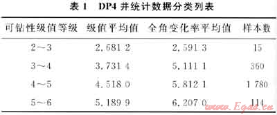 研究分析地層物性條件對水平井井眼軌跡的影響規(guī)律,至少需要解決2個問題:①地層物性條件的標(biāo)識問題,即如何將地層的各種物性特征按照統(tǒng)一標(biāo)準(zhǔn)歸類、分級;②如何建立地層物性條件與井眼姿態(tài)參數(shù)(井斜角、方位角)的對應(yīng)關(guān)系。其中,地層物性條件的標(biāo)識問題可以從眾多的地層可鉆性分級方法中優(yōu)選;而對于第二個問題則可以利用統(tǒng)計分析的方法建立某一區(qū)塊特定鉆具組合在復(fù)合鉆進(jìn)方式下的鉆進(jìn)特性與地層物性的統(tǒng)計關(guān)系予以解決。