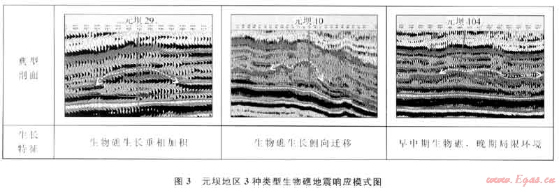 通過對元壩地區(qū)鉆錄井和三維地震資料的綜合分析,依據(jù)生物礁特征劃分提出了3種類型的生物礁:垂向加積生物礁、側(cè)向遷移生物礁及早期生物礁(圖3),3種生物礁的生長與儲層發(fā)育均具有顯著特點。在該認(rèn)識的指導(dǎo)下,提高了生物礁描述及井位優(yōu)選精度,保證了勘探部署井的高成功率。