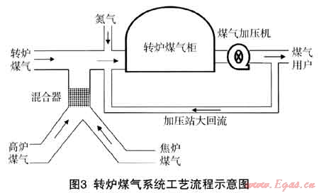 (2) 利用轉(zhuǎn)爐煤氣柜、煤氣加壓站、合成轉(zhuǎn)氣混合站等設(shè)施,在實際生產(chǎn)過程中町以實現(xiàn)焦爐煤氣和氮氣之間的定量、均勻混合,合成后的混合氣可以通過加壓站供給用戶使用。