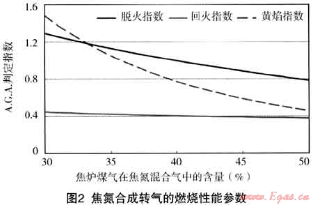 根據(jù)美國燃氣協(xié)會A.G.A.36#公告中公布的關(guān)于燃氣互換性預測的方法[2~4],利用“I”指數(shù)法,對焦氮混合氣替代高焦合成轉(zhuǎn)氣時的脫火指數(shù)、回火指數(shù)和黃焰指數(shù)進行了計算,其結(jié)果如圖2所示。