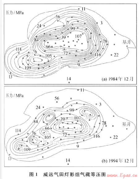 開發(fā)好水驅(qū)氣藏的關(guān)鍵是合理控制地層水活動。水侵有錐形水侵、縱竄型和橫侵型水侵,也可組合為復(fù)合型水侵。如威遠震旦系燈影組氣藏,1994年由于地層水縱竄橫侵,被分割成6個互不連通的區(qū)塊,氣井出水后產(chǎn)能下降幅度介于5%~50%(圖1)。