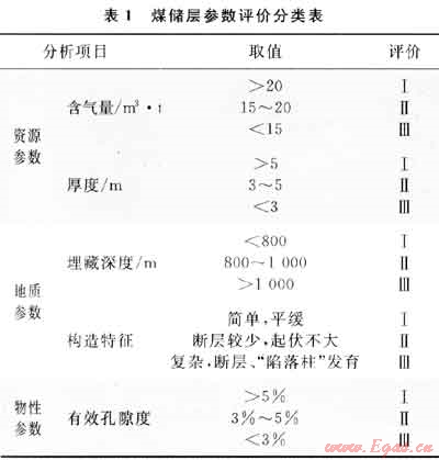 通過對(duì)煤儲(chǔ)層資源參數(shù)、地質(zhì)參數(shù)、儲(chǔ)層物性參數(shù)進(jìn)行評(píng)價(jià)和分類(表1),形成一套適合該區(qū)的煤儲(chǔ)層評(píng)價(jià)技術(shù)體系,并掌握了區(qū)內(nèi)含氣量分布特征(一般介于15~25m3/t,平均為20.2m3/t,66%的井含氣量大于20m3/t),劃分出3個(gè)Ⅰ類建產(chǎn)區(qū)、4個(gè)Ⅱ類建產(chǎn)區(qū)、4個(gè)Ⅲ類建產(chǎn)區(qū),為產(chǎn)能建設(shè)提供了有利區(qū)塊。