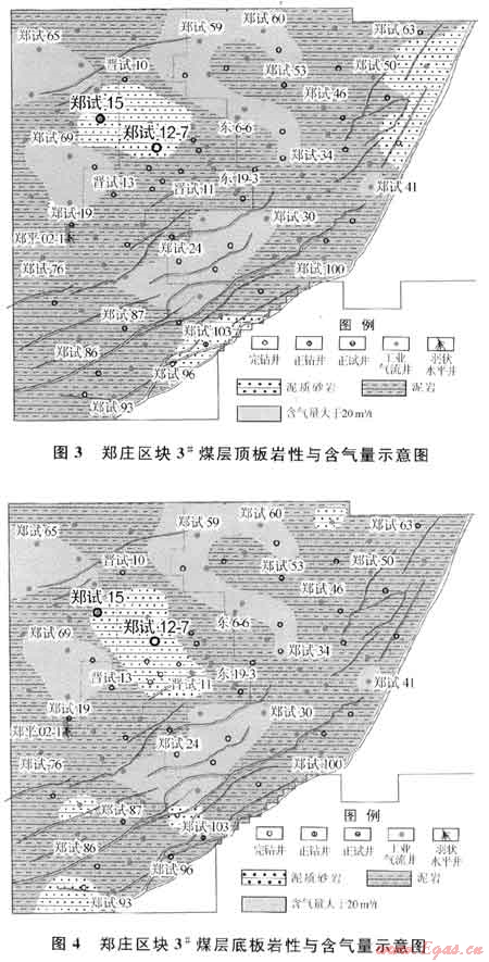 鄭莊地區(qū)3#煤層頂?shù)装鍘r性以泥巖、砂質(zhì)泥巖為主,具備很好的封堵效果,但在鄭試15井-鄭12-7井所在區(qū)域,頂?shù)装寰鶠槟噘|(zhì)砂巖(圖3、4),鄭試61井-鄭試49井區(qū)域,其頂板或底板為泥質(zhì)砂巖,2塊區(qū)域頂?shù)装宓姆舛滦Ч患澳鄮r區(qū)域,導(dǎo)致含氣量(小于15m3/t)與周邊區(qū)域相比較低。