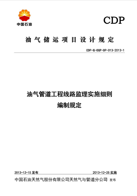 油氣管道工程線路監(jiān)理實(shí)施細(xì)則編制規(guī)定CDP-G-OGP-OP-013-2013-1:本文件規(guī)定了油氣管道工程線路監(jiān)理實(shí)施細(xì)則的編制格式、框架、主要內(nèi)容,以及報(bào)批、審查和修訂的基本要求。