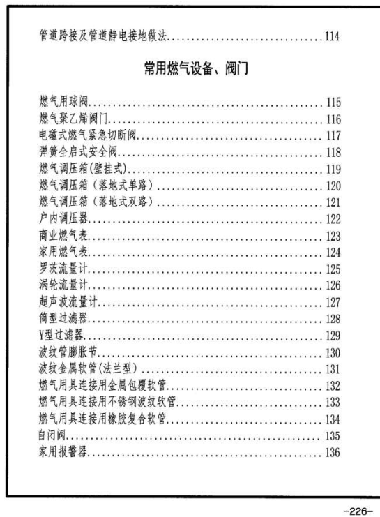 3.10本圖集“常用燃?xì)庠O(shè)備、閥門”列示了常用閥門、調(diào)壓箱、計(jì)量表等,根據(jù)最新國家規(guī)范的要求,增加了燃?xì)庥镁哌B接用不銹鋼波紋管、燃?xì)廨斔陀貌讳P鋼波紋管,自閉閥等國家規(guī)范要求或推薦使用的材料。由于市場上燃具和用氣設(shè)備種類繁多、更新?lián)Q代較快,故取消了原燃具和用氣設(shè)備圖示。